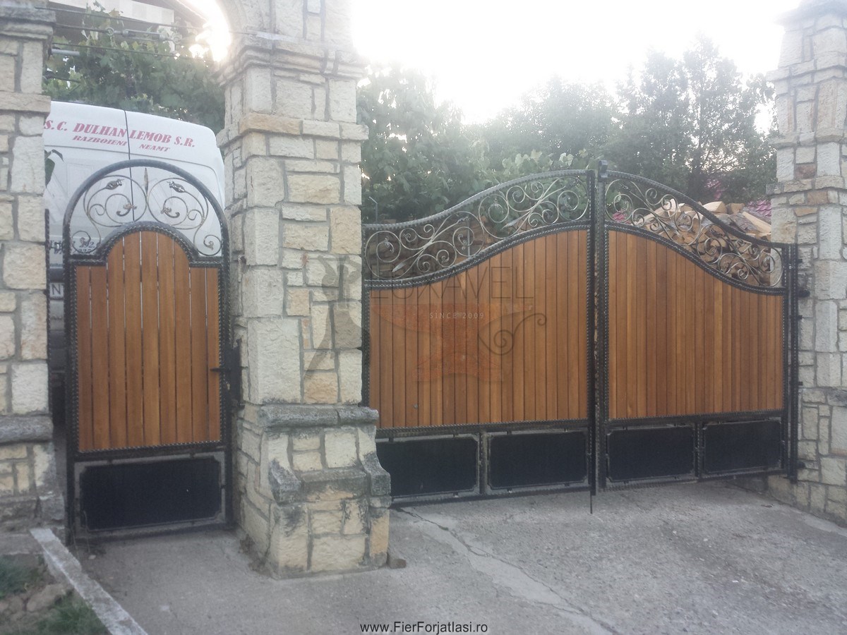 Va oferim poarta din fier forjat cu lemn model deosebit L023, realizata din fier forjat si lemn cu multa atentie si precizie pentru a putea oferi o solutie pentru calea de acces, sigura, solida, robusta si datorita elementelor decorative din fier forjat, poarta de acces capata o nota deosebita de eleganta.