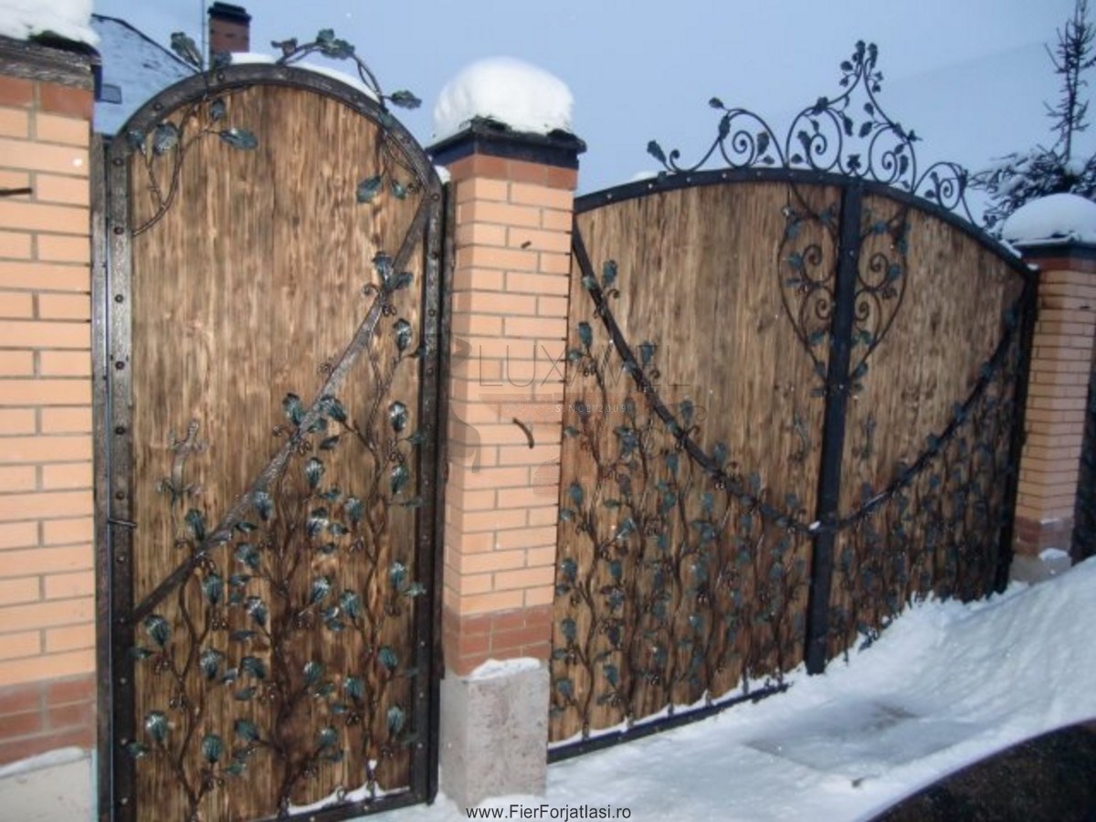 Va oferim poarta din fier forjat cu lemn model deosebit L030, realizata din fier forjat si lemn cu multa atentie si precizie pentru a putea oferi o solutie pentru calea de acces, sigura, solida, robusta si datorita elementelor decorative din fier forjat, poarta de acces capata o nota deosebita de eleganta.