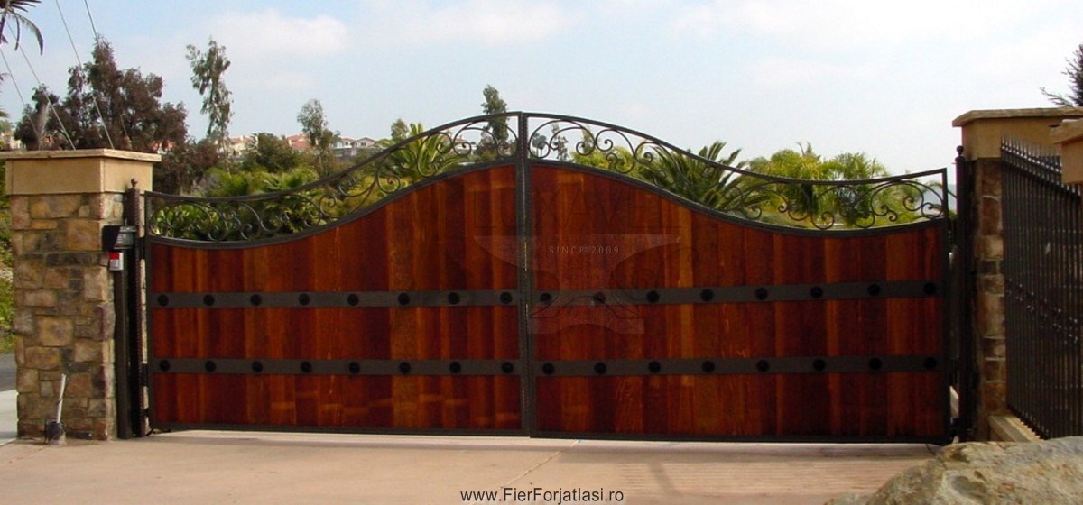Va oferim poarta din fier forjat cu lemn model deosebit L032, realizata din fier forjat si lemn cu multa atentie si precizie pentru a putea oferi o solutie pentru calea de acces, sigura, solida, robusta si datorita elementelor decorative din fier forjat, poarta de acces capata o nota deosebita de eleganta.
