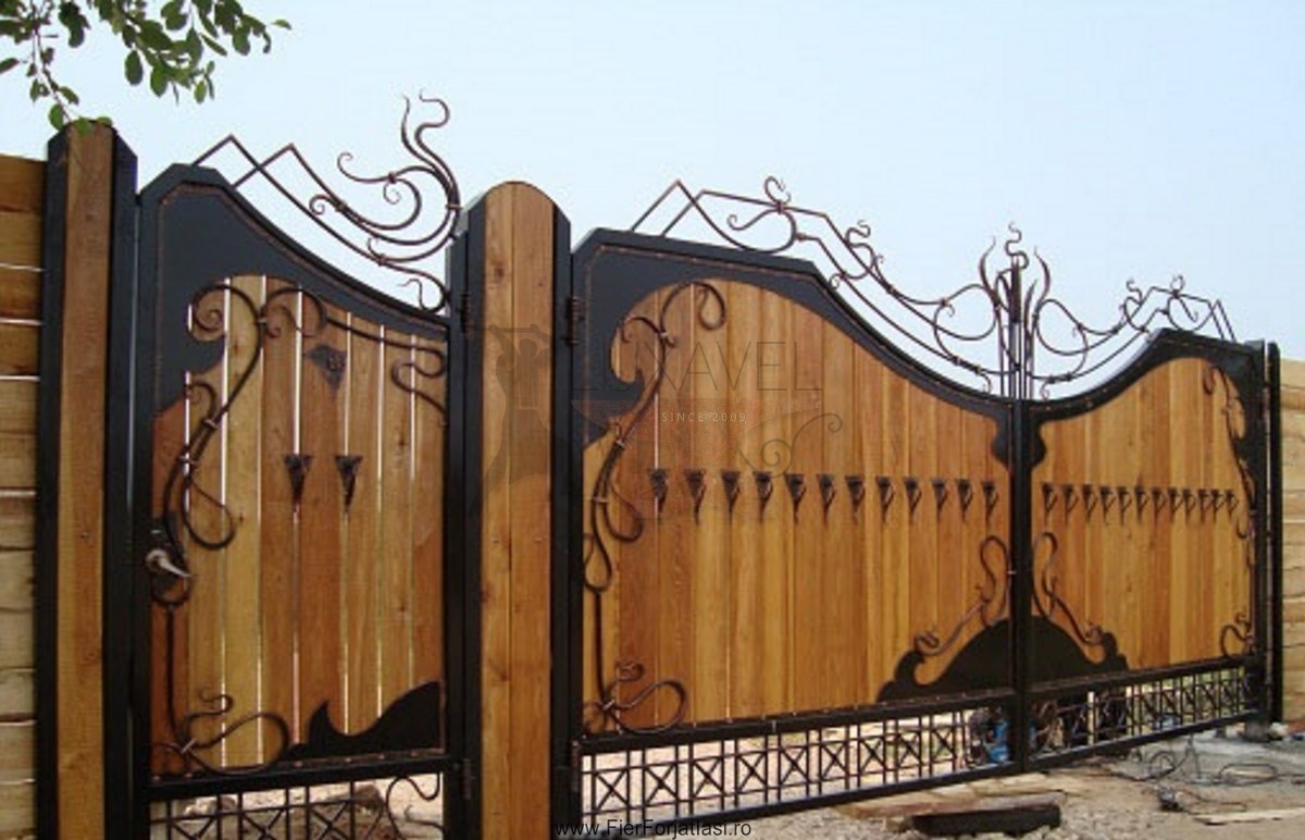 Va oferim poarta din fier forjat cu lemn model deosebit L007, realizata din fier forjat si lemn cu multa atentie si precizie pentru a putea oferi o solutie pentru calea de acces, sigura, solida, robusta si datorita elementelor decorative din fier forjat, poarta de acces capata o nota deosebita de eleganta.