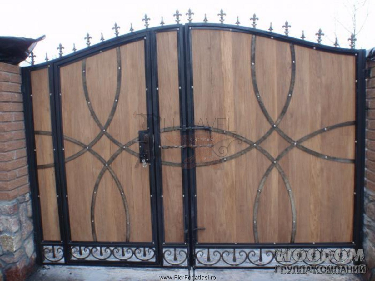 Va oferim poarta din fier forjat cu lemn model deosebit L021, realizata din fier forjat si lemn cu multa atentie si precizie pentru a putea oferi o solutie pentru calea de acces, sigura, solida, robusta si datorita elementelor decorative din fier forjat, poarta de acces capata o nota deosebita de eleganta.