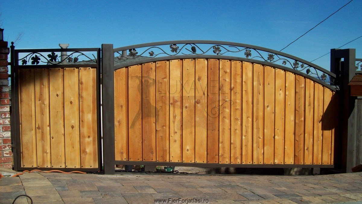 Va oferim poarta din fier forjat cu lemn model deosebit L024, realizata din fier forjat si lemn cu multa atentie si precizie pentru a putea oferi o solutie pentru calea de acces, sigura, solida, robusta si datorita elementelor decorative din fier forjat, poarta de acces capata o nota deosebita de eleganta.