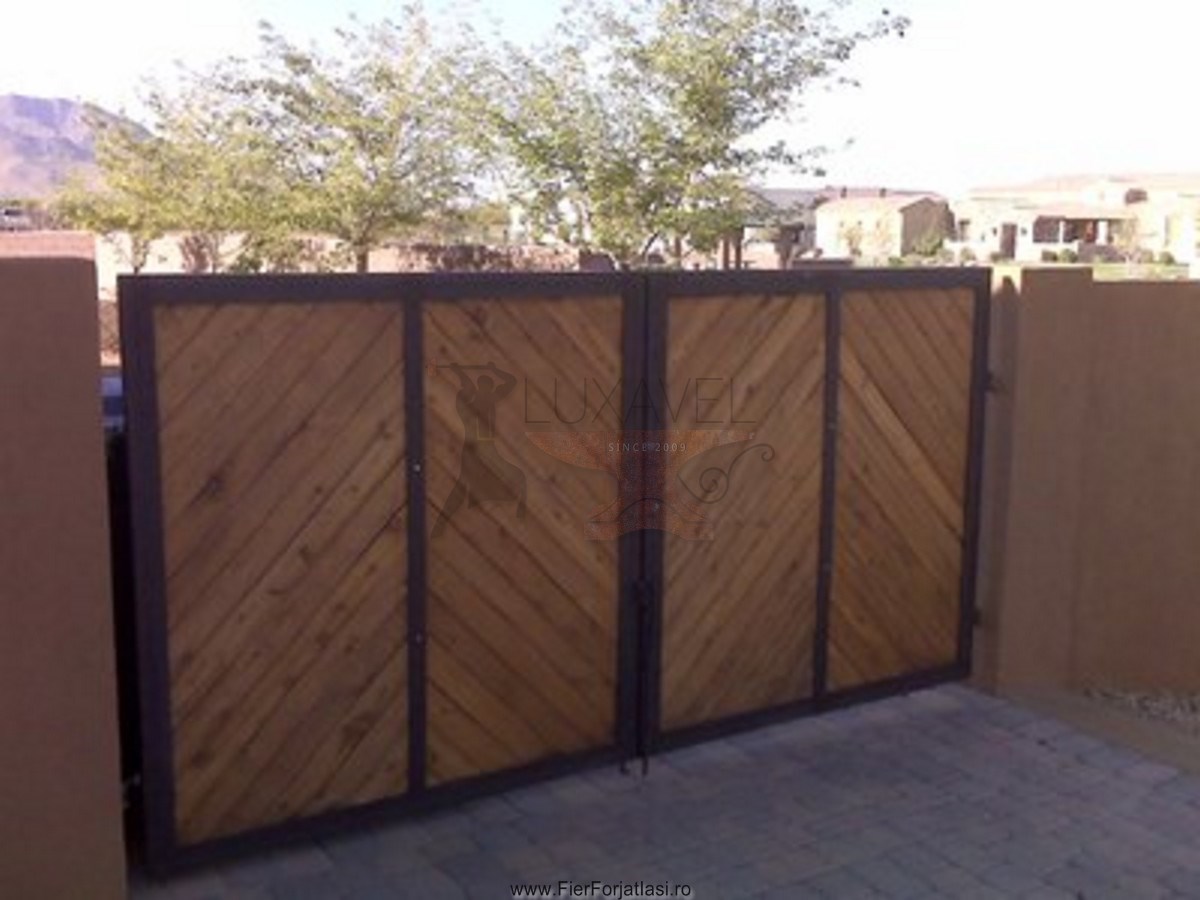 Va oferim poarta din fier forjat cu lemn model deosebit L025, realizata din fier forjat si lemn cu multa atentie si precizie pentru a putea oferi o solutie pentru calea de acces, sigura, solida, robusta si datorita elementelor decorative din fier forjat, poarta de acces capata o nota deosebita de eleganta.