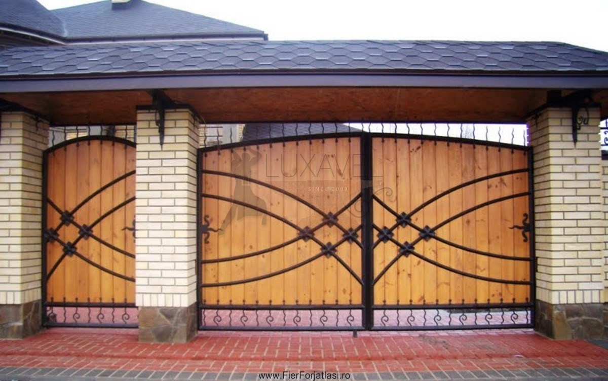 Va oferim poarta din fier forjat cu lemn model deosebit L034, realizata din fier forjat si lemn cu multa atentie si precizie pentru a putea oferi o solutie pentru calea de acces, sigura, solida, robusta si datorita elementelor decorative din fier forjat, poarta de acces capata o nota deosebita de eleganta.