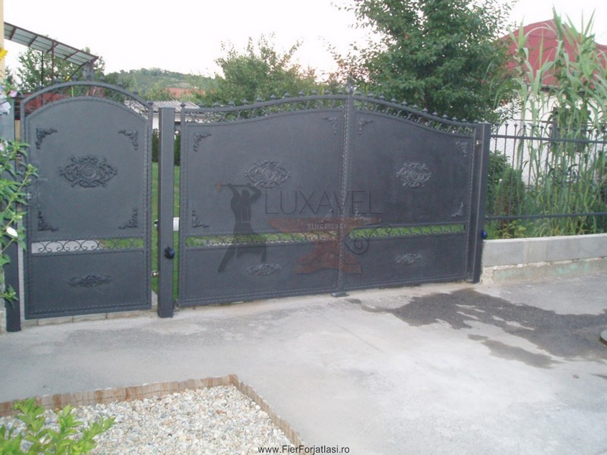 Va oferim poarta din fie forjat cu tabla modelul T144, realizata din fier forjat si partial tabla cu multa atentie si precizie ce ofera o solutie sigura, solida, robusta pentru calea de acces, iar datorita elementelor decorative din fier forjat, poarta de acces capata o nota deosebita de eleganta.