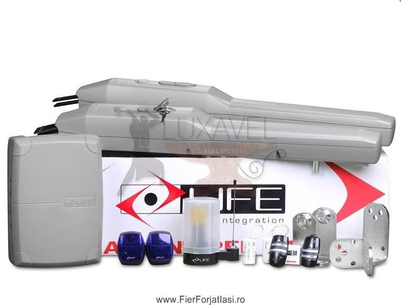 Kit automatizare poarta batanta 2x3 metri cu max 400 Kg / canat Producator LIFE Italia. Programamare foarte usoara, nu necesita cunostinte evoluate. Kitul vine Pre - Instalat, se poate utiliza direct dupa alimentarea la reteaua electrica. Un set din care nu lipsește nimic! Kit-ul Optimo 3 este format din doua brate motorizate, un panou de control, o lampa de avertizare, doua fotocelule si doua telecomezi. Rezultatul final este controlul absolut al portii fara compromis. Automatizarile de poarta batanta se instaleaza deobicei in interiorul curtii fara a intervenii asupra designului arhitectural al gardului. Operarea automatizarii de poarta se poate face in mai multe moduri cum ar fi printr-o telecomanda de la distanta sau cu ajutorul unui comunicator GSM direct din telefon. (Cu ajutorul modulului ESIM 110) Panoul central ofera multe optiuni de control si caracteristici de securitate. Pentru functionarea in siguranta a instalatiei este obligatoriu sa montati si cele doua fotocelule furnizate Ce trebuie sa stiti Automatizarea de poarta Optimo 3 poate automatiza porti batante cu greutatea maxima de 400 Kg/foaie respectiv 3 metri lungime/foaie. Aceasta este potrivita atat pentru uz rezidential cat si pentru uz comercial. Motorul functioneaza la 220 V si astfel automatizarea se poate folosii pentru un ciclu de deschidere de 35% / zi. Mecanismele sunt produse complet din aluminiu si sunt acoperite cu zinc pentru a oferii fiabilitate maxima. Automatizarea de poarta Life Optimo 3 are un motor silentios, durabil si care nu are nevoie de o intretinere speciala. In cazul unei pene de curent este posibila actionarea motoarelor manual cu ajutorul unei chei speciale furnizate in pachet. Specificatii tehnice Greutate maxima / canat 400 KG Dimensiunea max / canat 3 metri Alimentare 230V Putere motor 210W Forta motor 2000N Temperatura funtionare -25 + 50 grade Cilcu de lucru 35% Viteza deschidere 22 secunde cursa completa Unghi max deschidere 110 grade Lungime brat 820MM Kitul de automatizare poarta batanta 2x3 metri contine: 2 x Motoare 1 x Centrala de comanda 2 x Telecomenzi 1 x set Fotocelule 1 x Lampa de semnalizare cu antena 2 x set Elemente de prindere pe poarta si stalp 1 x Manual de instalare si programare Important: Pentru judetul IASI oferim montajul GRATUIT!