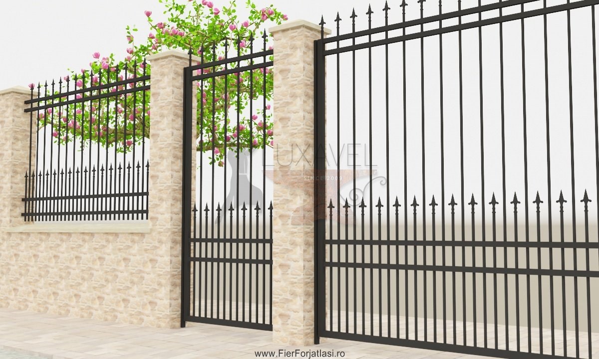Poarta din fier forjat PX004 este o poarta potrivita atat pentru uz rezidential cat si industrial. Modelul imbina simplitatea cu efecte de design. Extras materiale: • Cadru – teava rectangulara lisa 40x30x2 mm • Profile verticale – teava lisa 15x15x1,5 mm • Arcade si profile orizontale – otel lat lis 25x4 mm